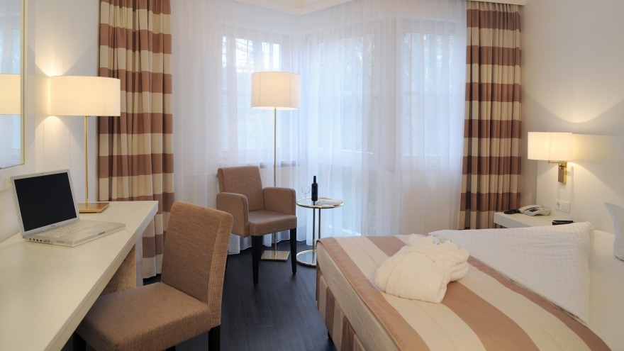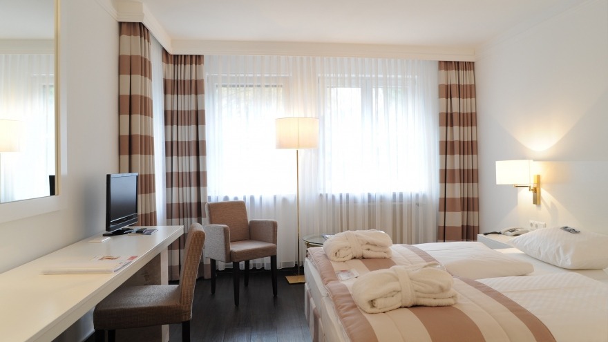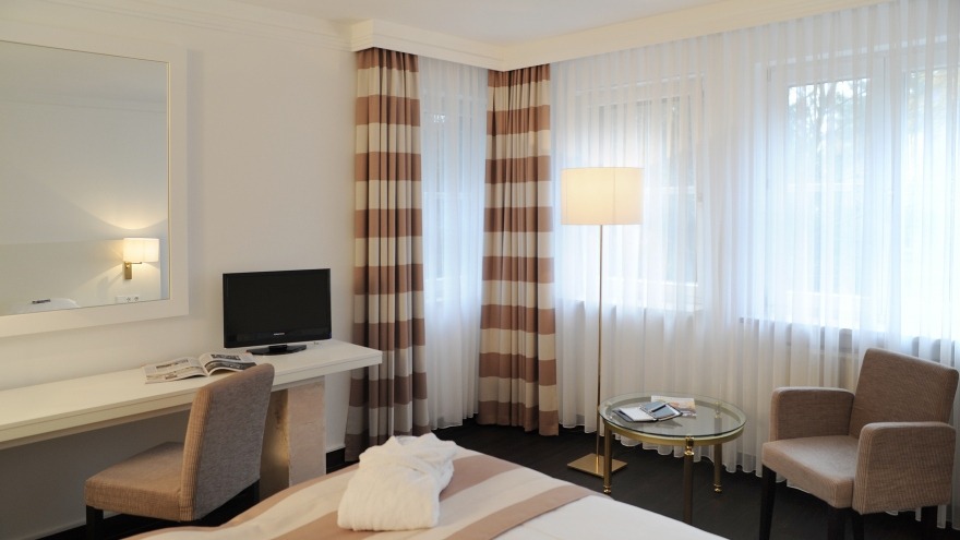 Our bright and comfortable furnished Superior rooms in the side wing are facing our courtyard or the forest. The rooms are equipped with bathtub or shower and toilet, phone, minibar and desk.