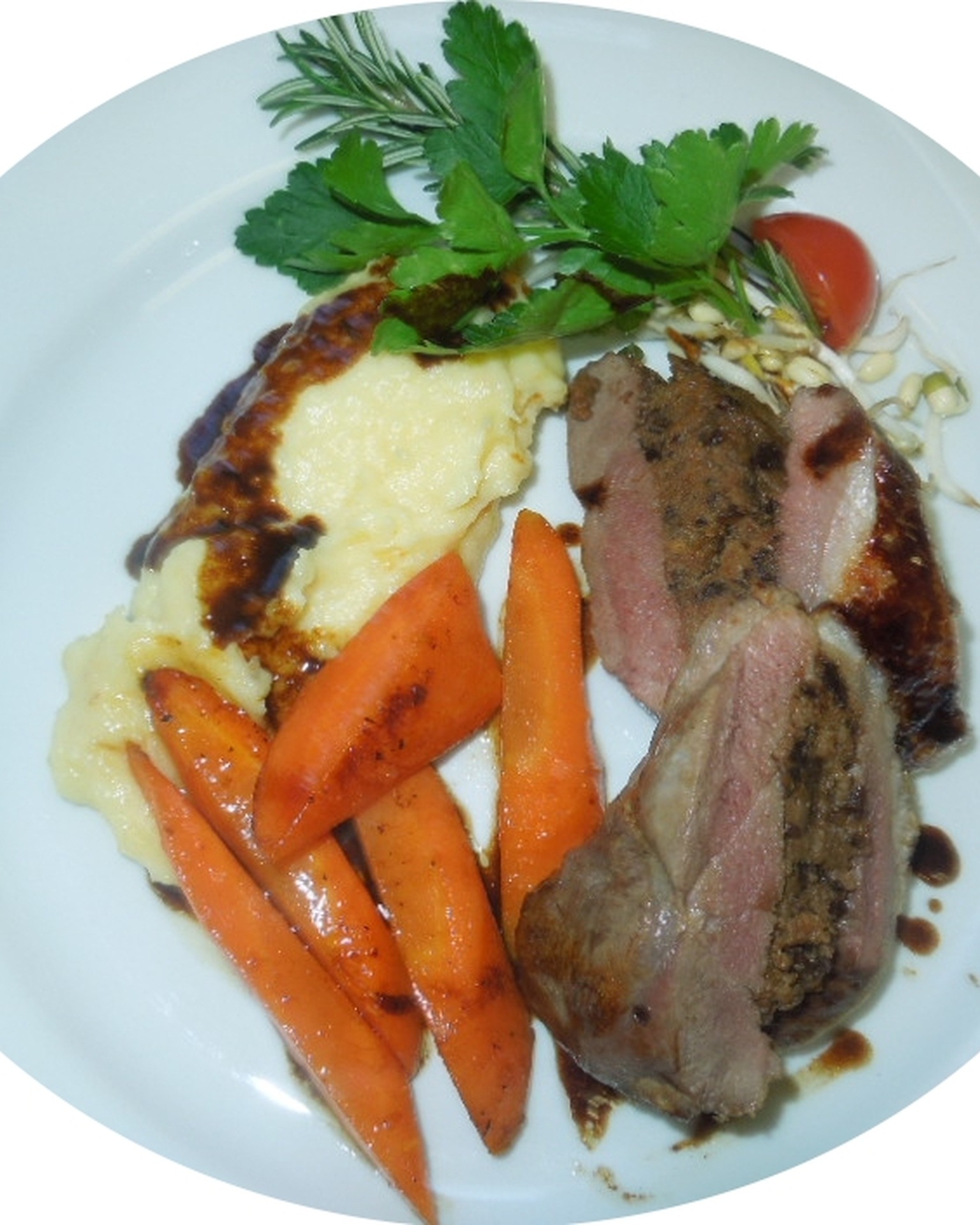 Entenbrust, gefüllt mit Pflaumen und Mandeln, an Kartoffelpüree und Fingermöhren