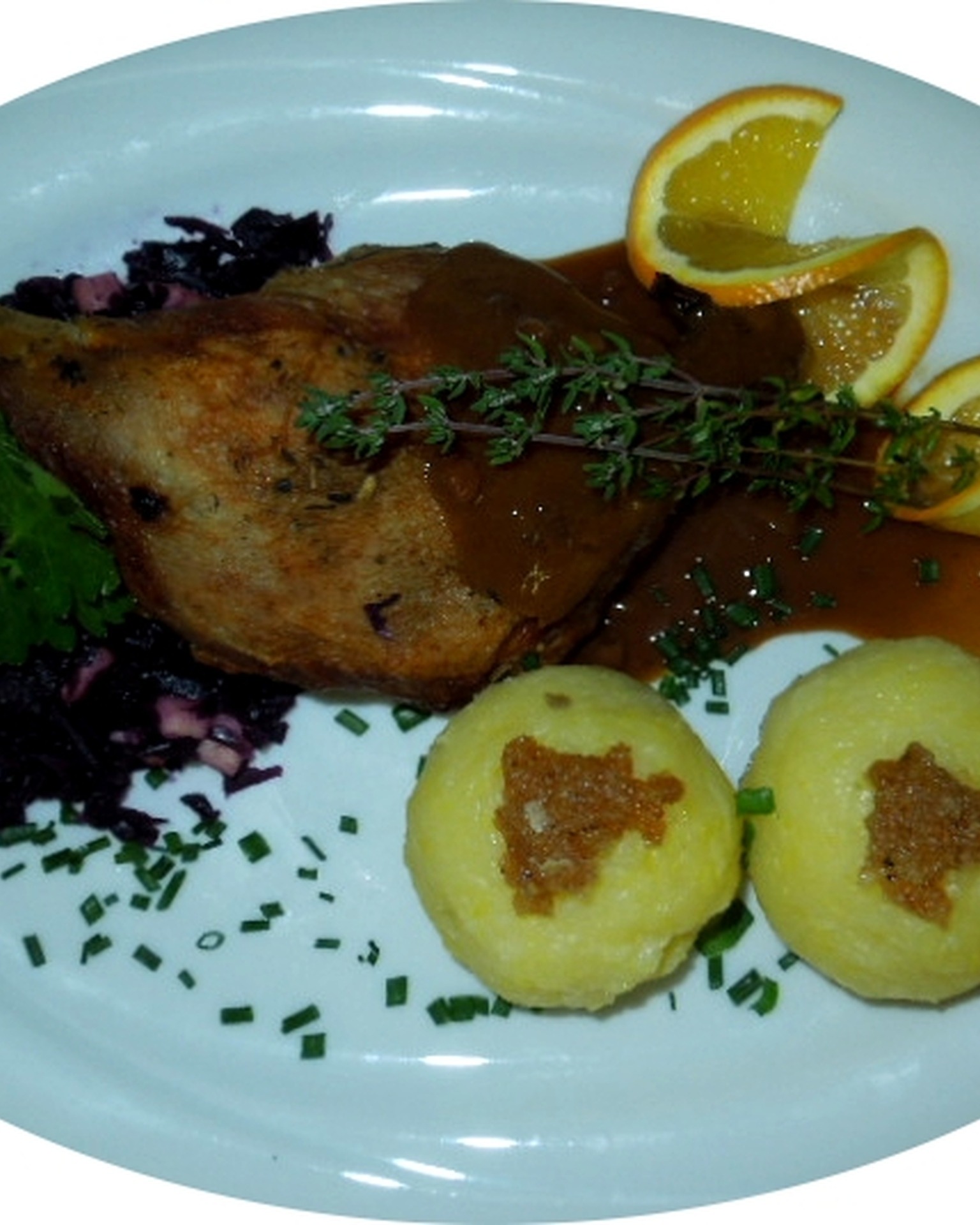 Geschmorte Gänsebrust oder -keule mit Apfelrotkohl und Kartoffelklößen