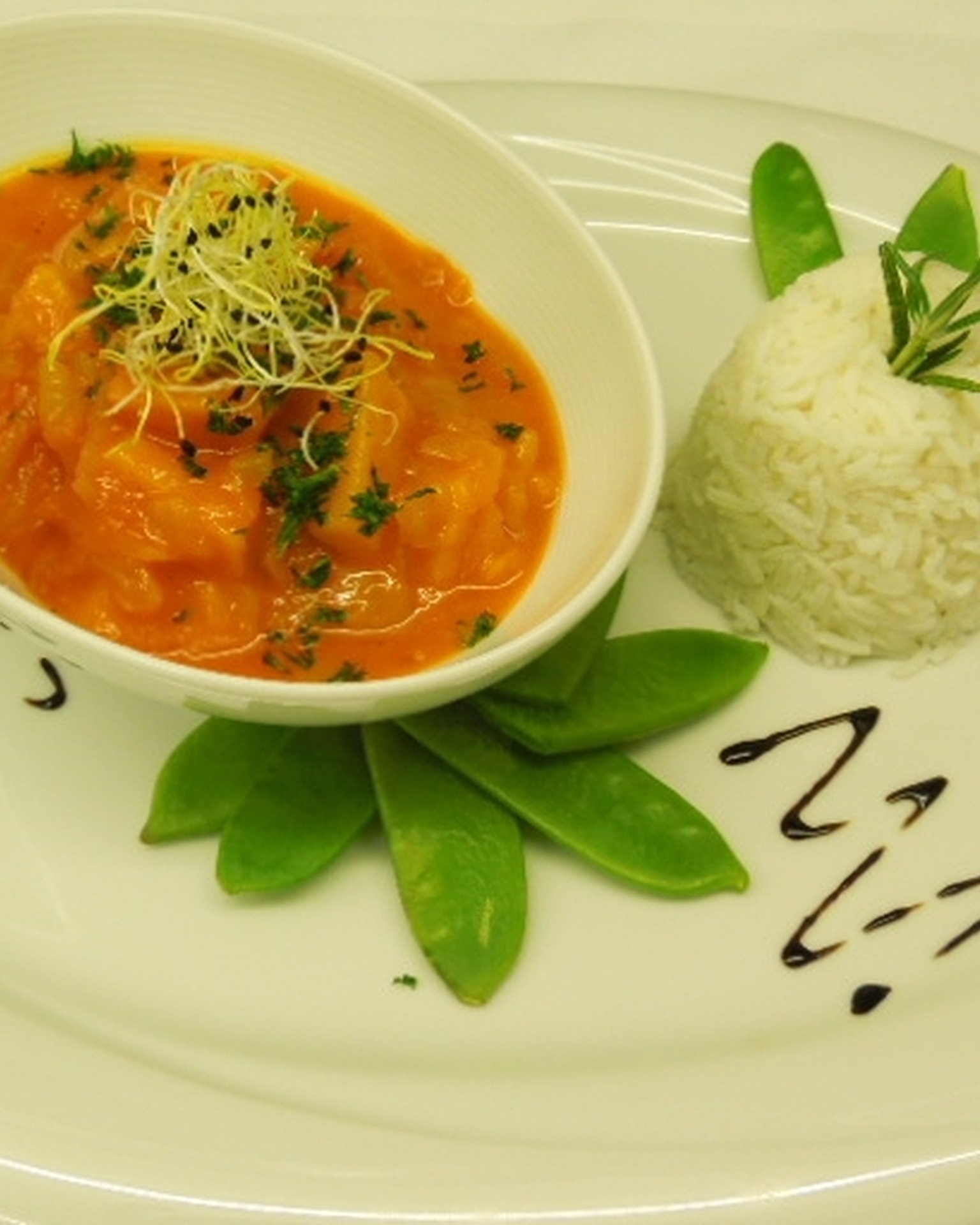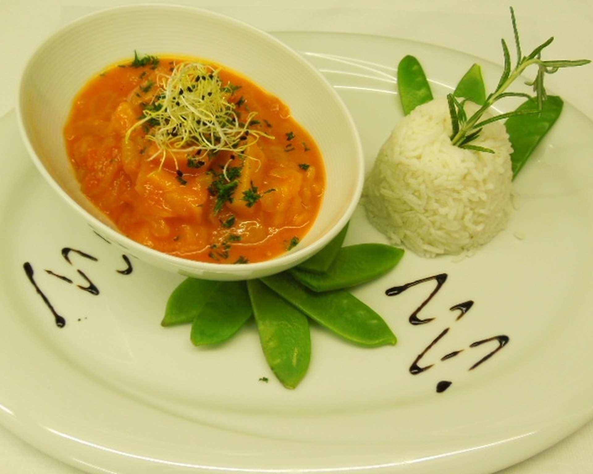 Kürbisgulasch mit Duftreis und glasierten Zuckerschoten