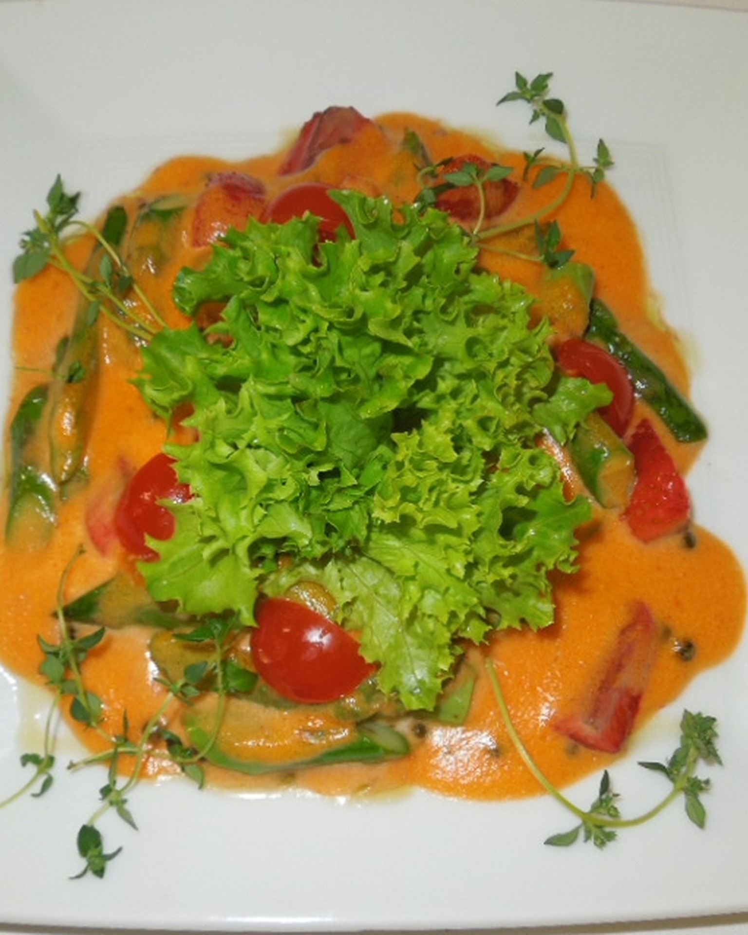 Den Spargel anschließend in einer kleinen Pfanne mit den Erdbeervierteln anbraten, mit dem gemahlenen grünen Pfeffer, Salz und etwas Honig würzen. Auf einem Teller schön anrichten, Sauce Choron darüber geben und servieren.